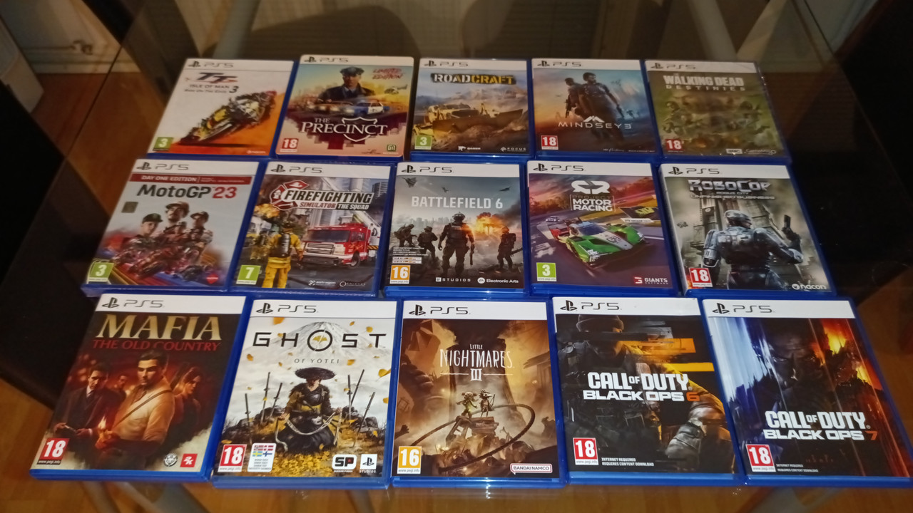 1. Vuonna 2025 ostetut pelit, jotka olen myös pelannut. Ja heti virhe kuvassa, sillä en minä ole Little Nightmares III:sta edes avannut paketista. Kuvassa myös toisena virheenä se, että siitä puuttuu Cuphead Limited Edition.